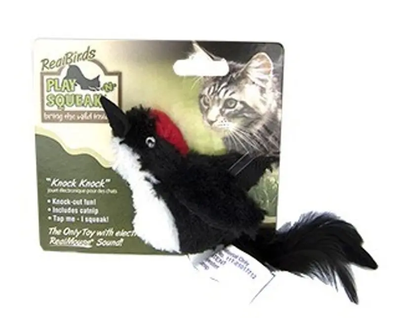 Den inneboende fågeljägaren i alla farliga små tigrar och lejon kommer att jubla över denna lilla hackspett med realistiskt pipljud, kattmynta i fyllningen och långa frestande stjärtfjädrar.