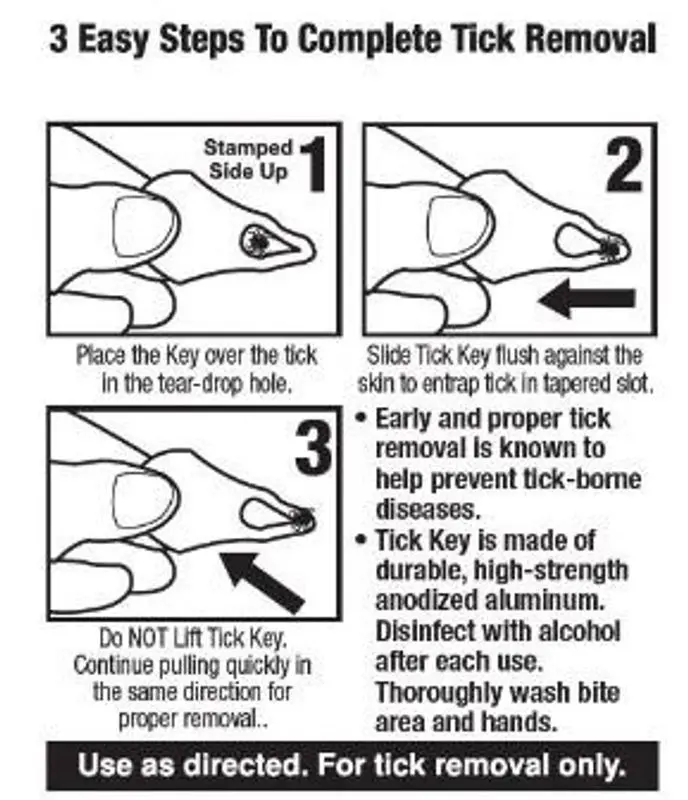 Du placerar nyckeln med det stora hålet över fästingen. Dra nyckeln bort från fästingen så att den hamnar i den smala springan, nyckeln glider då längs med huden. Se produktbild nr 3. Fästingen avlägsnas enkelt, med dess huvud och allt! Denna design har fulländats och testats i över ett decennium och har bidragit till borttagningen av tusentals och åter tusentals fästingar av alla storlekar (inklusive rådjursfästingar och hundfästingar) i många olika länder av världens alla hörn.