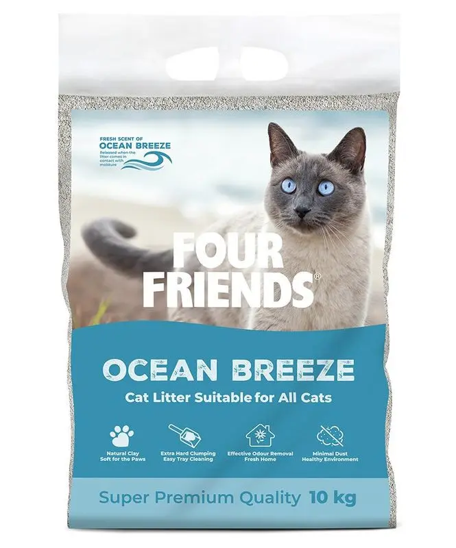 Kattsand av hög kvalitét som dammar minimalt och effektivt kapslar in dålig lukt, när den blir fuktig har den en fräsch doft av havsbris. Den bildar kompakta klumpar som gör det lätt att rensa kattlådan med spade.