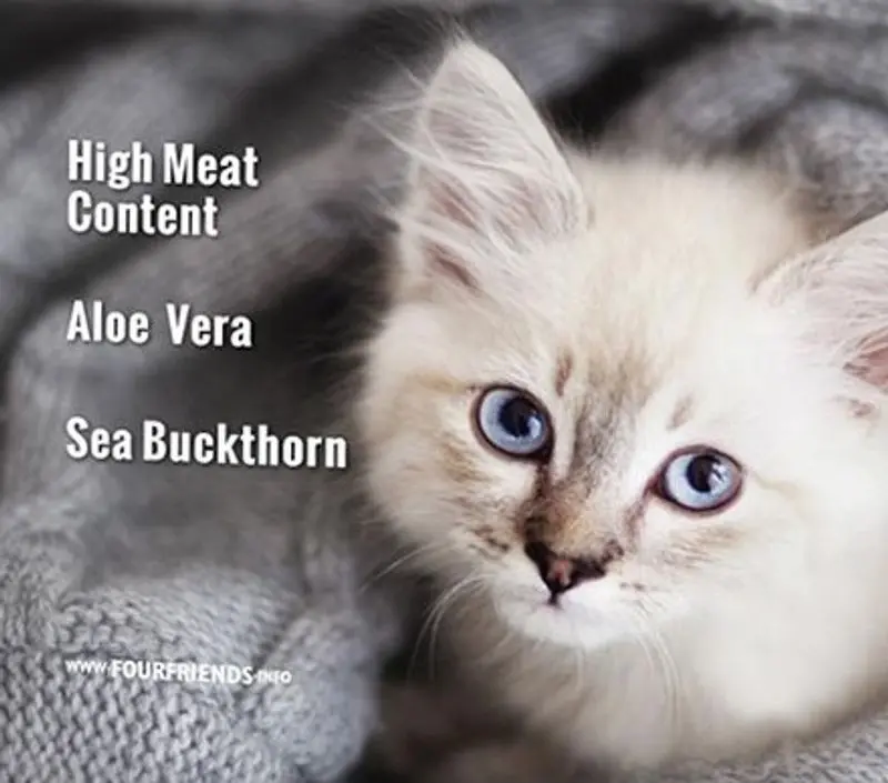 Innehållet på 60 % torkat kött från anka, kalkon, kyckling och lax ger ett högt animaliskt proteininnehåll som stödjer en bra utveckling av bland annat muskler. Laxolja och kycklingfett bidrar med nyttiga omegafettsyror, och DHA för det centrala nervsystemets, hjärnans och synens utveckling. Aloe vera bidrar till effektivare näringsupptag och havtornsextrakt för sunda urinvägar.
