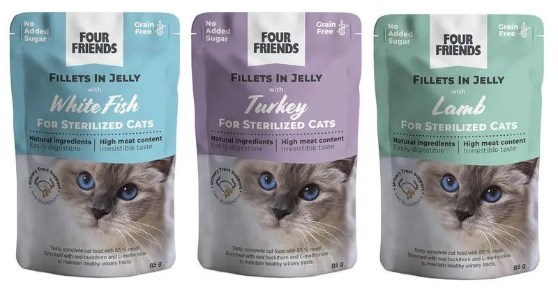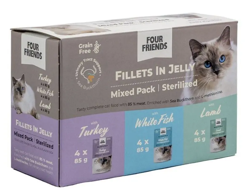 FourFriends Sterilized mix Gele - är ett helfoder som passar alla vuxna katter. "Helfoder" betyder att kattmaten innehåller allt det en katt behöver i sin kost! Receptet är berikat med havtorn och aminosyran L-methionine för att bibehålla friska urinvägar, vilket gör den här mixen extra lämplig för kastrerade katter.