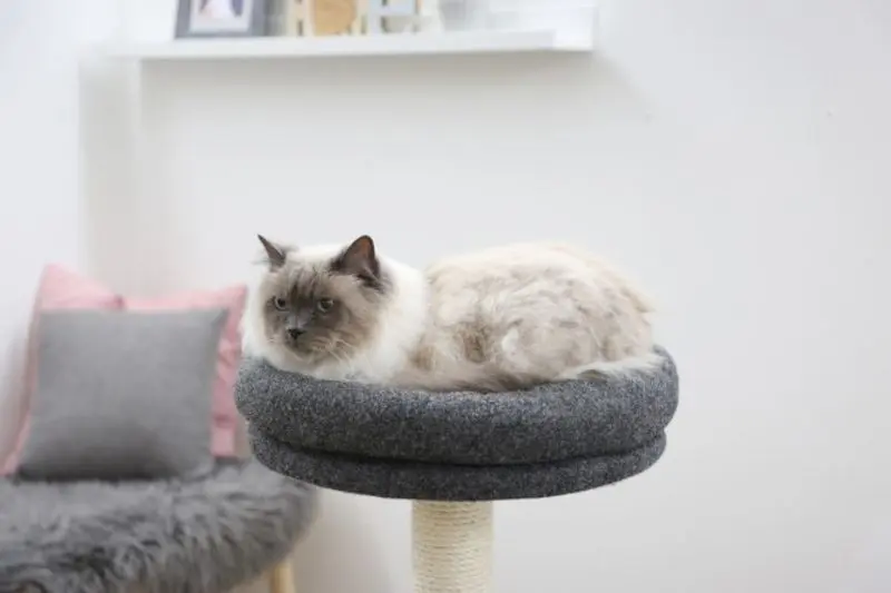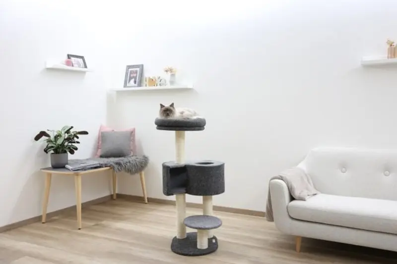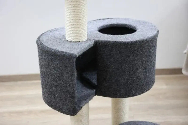 Annorlunda klösträd med filtat tyg istället för plyschtyg, snygg och stilren design. Mjuk och mysig bädd i toppen och rolig tittut-koja i mitten, perfekt för förvaring av kattens leksaker om katten själv inte vill använda grottan för lek eller tupplurar. Klöspelare med lindat sisalrep som uppmuntrar katten till att markera revir på sin klätterställning.