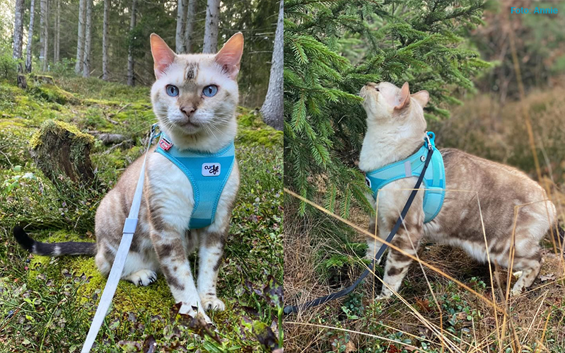 Till en början hade vi en gammal kattsele och en stor transportbur. Då stora världen var ny för Nalle som lätt blev osäker och rädd så hade jag hela tiden transportburen i handen på våra promenader (inte så praktiskt, när man gärna ville passa på att plocka både bär och svamp när man va i skogen). Selen vi hade var inte rymningssäker och Nalle kunde lätt komma ur den om han lade i backen. Men så skaffade vi en sele från Curli och med den känner jag mig trygg med att han inte kommer ur! Det fick vi bevisat när två mopeder kom mot oss i hög hastighet och Nalle fick panik. Men jag kunde få tag på honom och lugna ner honom. Selen hindrar inte heller hans rörelsemönster utan kan lätt klättra över stock och sten som han älskar!