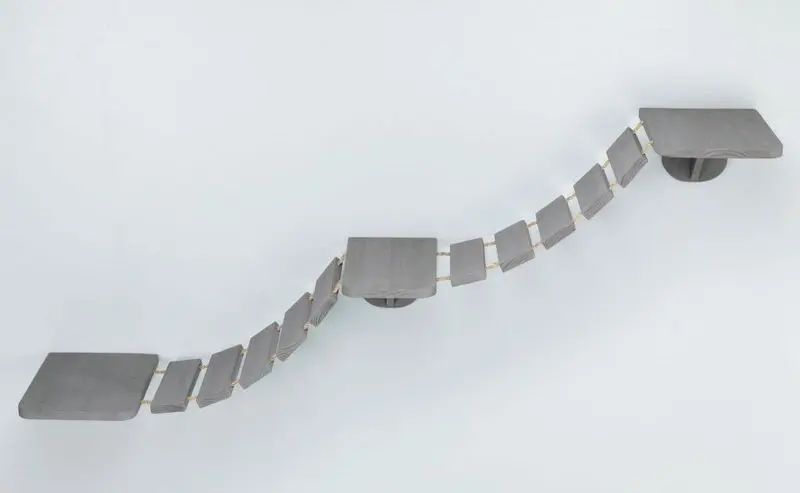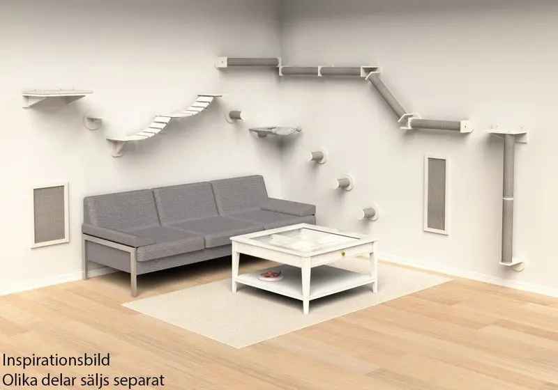 Kan monteras helt plant, som en hängbro som kanske leder din katt från t ex klösträdets högsta punkt och vidare till en garderob. Eller så kan den monteras lite lutande så att den blir en klätterstege, kanske från byrån och upp till klösträdet. Bara er fantasi sätter gränserna för denna roliga produkt.