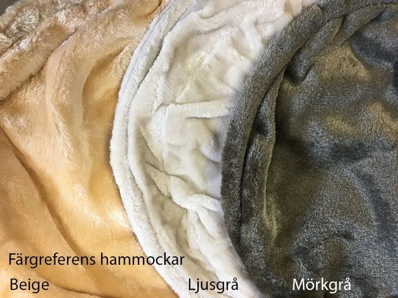 Färgkartan med de 3 olika plyschtygerna på de olika hammockarna är med som färgreferens. Denna "ljusgrå" färg är lite svår att beskriva då den kan kallas både "naturvit", "smutsvit", "ljusgrå" och vissa kunder tycker att den drar lite åt beige.