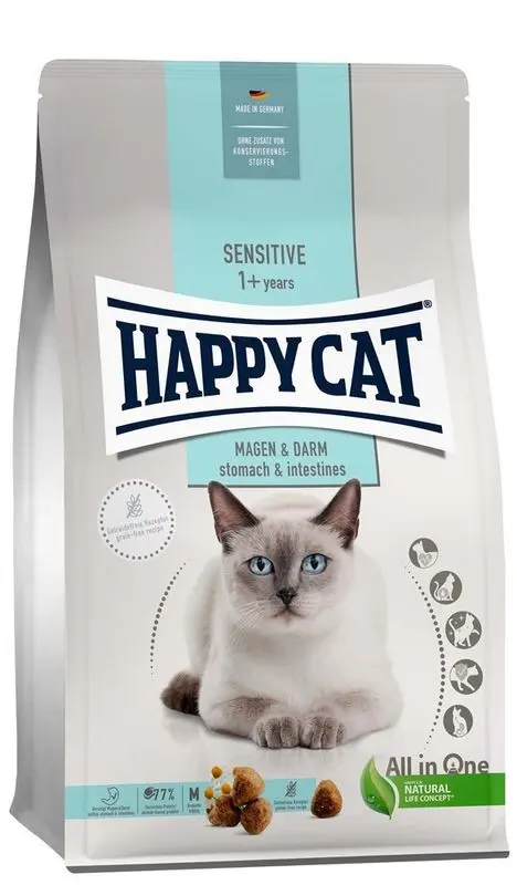Liten smakpåse torrfoder för katt med känslig mage. HappyCat Care Stomach and Intestines är tillagat med anka och ris och är skonsamt mot mage och tarm. Receptet är glutenfritt, proteinrikt och lättsmält., och har även örter som kamomill och lakritsrot, som är skonsamma och främjar matsmältningen.