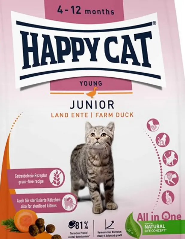 HappyCat Kitten GrainFree Farm Duck är ett torrfoder i extra små bitar anpassat för kattungar. Receptet med lättsmälta proteiner från frigående fågel, vitaminrika morötter och Rosmarin från medelhavet ger din kattungen den perfekta grunden för välmående.
