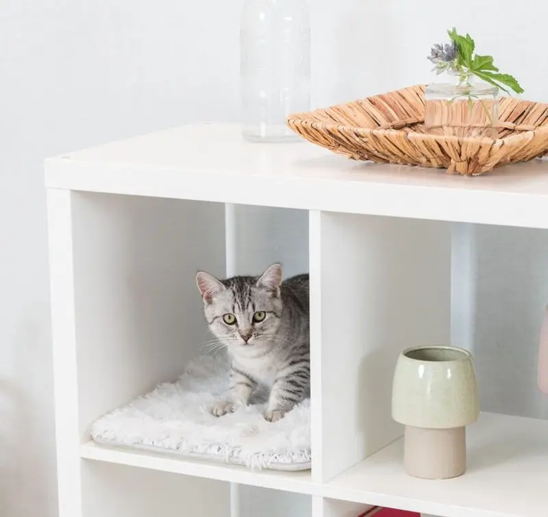 Den populära serien med kattprodukter Harvey kännetecknas av den långhåriga och supermjuka plyschen i grå färg. Denna mindre dyna, med antiglid-undersida, passar perfekt i Ikeas möbler som heter Kallax eller den äldre serien Expedit.Perfekt sovställa för din kisse som vill vara med! I skrivbordet som heter Kallax kan din kisse hänga i hyllan brevid dig när du pysslar eller jobbar hemifrån. I bokhyllan Kallax kan din katt relaxa i ett eget krypin i vardagsrummet, katter vill ofta hänga i samma rum som familjen är.