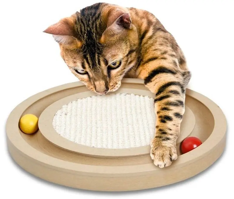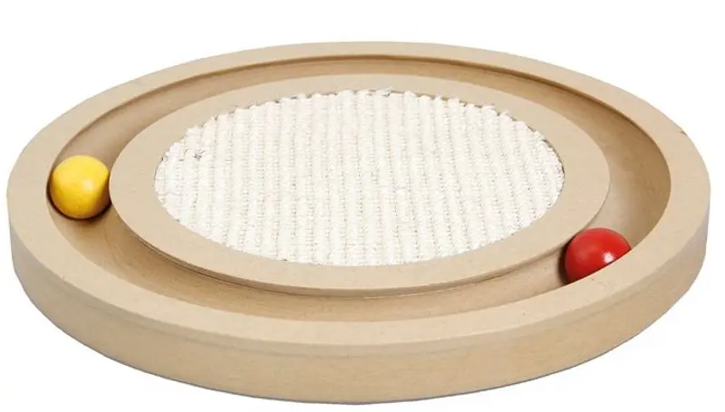 Kattleksak i trä till din katt med både bollbana med 2 st träkulor samt klösmatta ovanpå. Riktigt bra kvalité och perfekt för dig som gärna undviker plast i hemmet.
