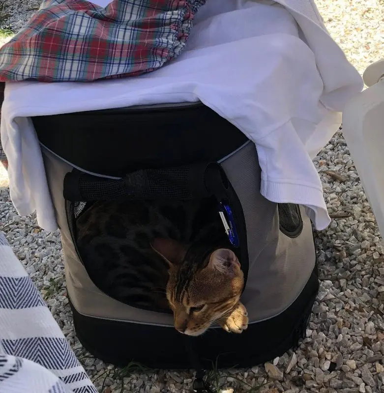 Väskan kan öppnas framtill och på ovansidan för katten och har ett kort koppel fäst på väskans insida så att katten inte kan hoppa ut om man vill ha väskan lite öppen. Vadderad dyna inuti med tvättbart överdrag.