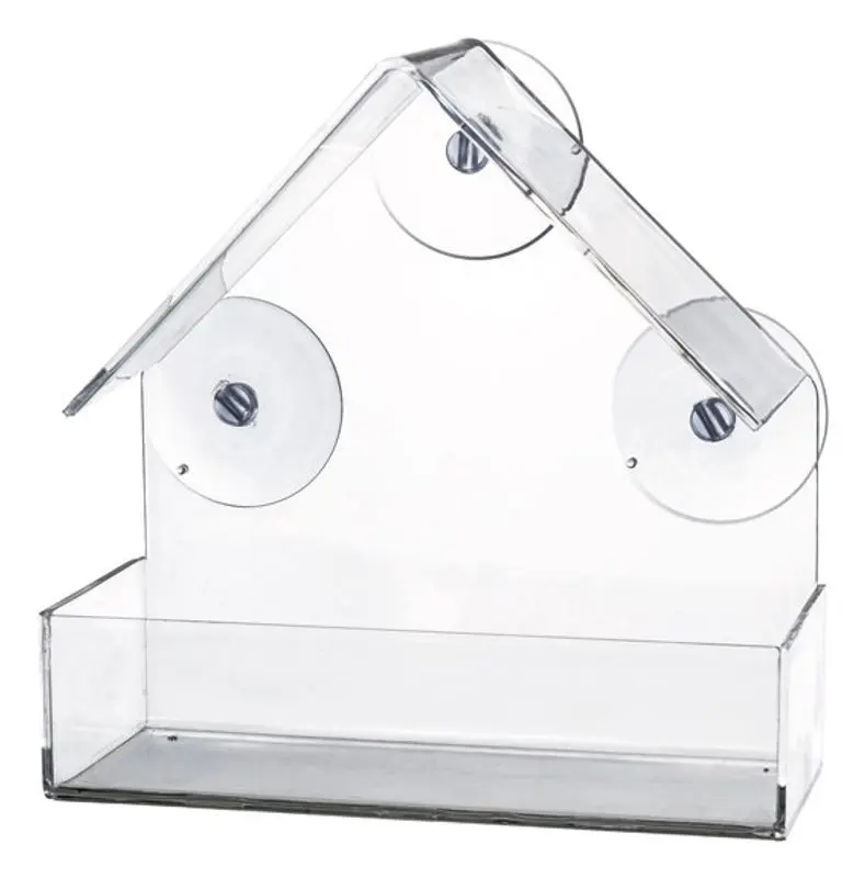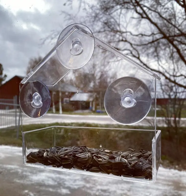 Denna fågelmatare sätter du upp på fönstret utomhus, fyller på med lite fågelmat och sedan sätter ni er inomhus och inväntar gäster till matbordet.