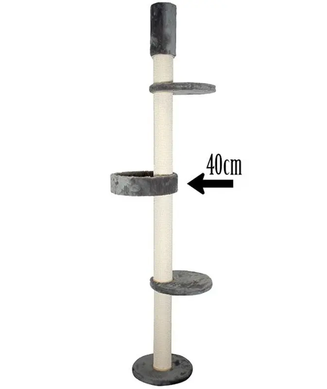 Hylla utan kant i 3 olika storlekar, cremevit plyschtyg både ovantill och under botten på hyllan. Rund hylla med förborrat hål som passar till alla klösträd från märket Kattens No.1