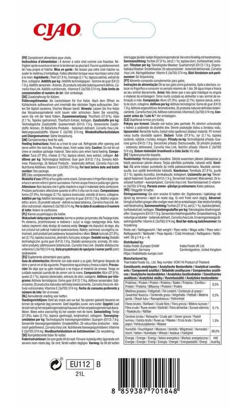 Ingredienser: Tonfisk (27,9%), ost (2,1%), tapioka (torkad), tonfiskextrakt, kollagen.
