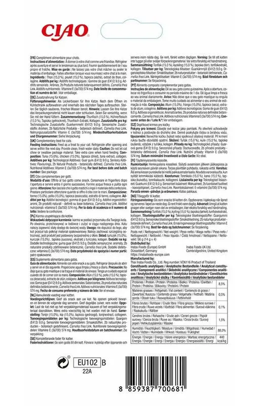 Ingredienser: tonfisk (15%), kyckling (15%), tapioka, tonfiskextrakt, kollagen, grönt te-extrakt.