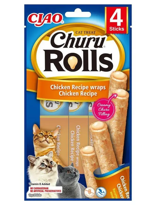 Gillar din katt kattgodis med kyckling? Då kommer den hoppa av glädje över att få smaka Churu Rolls med kyckling. Dessa helt spannmålsfria kattgodisarna är tillverkade med en mjukbakad utsida och en krämig fyllning inuti - två läckra texturer i samma tugga.