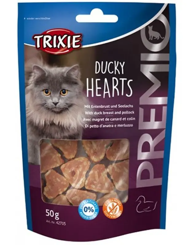 Smaskiga små hjärtan med anka och pollock, 65% köttinnehåll och 18% fiskinnehåll. Återförslutningsbar påse som håller kattgodiset fräsht.