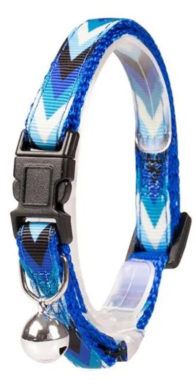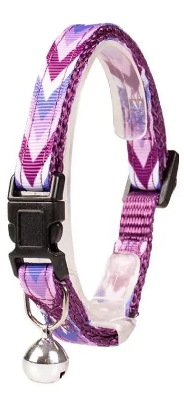 Katthalsband i mjuk mönstrad nylon med både safetyspänne och resårdel. Halsbandet finns i 2 olika färger, ett lila och ett blått