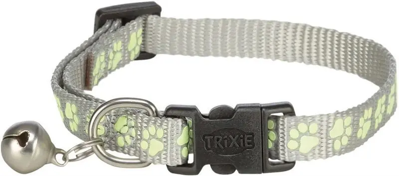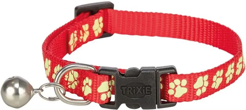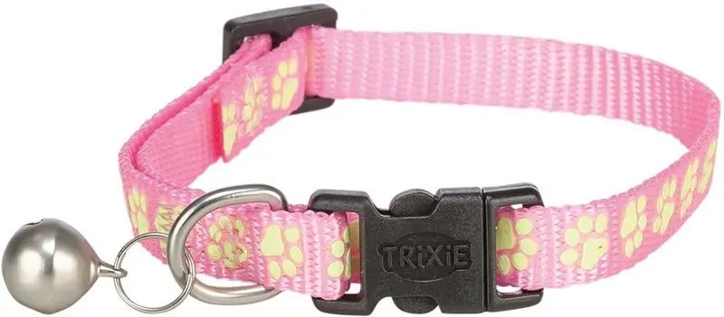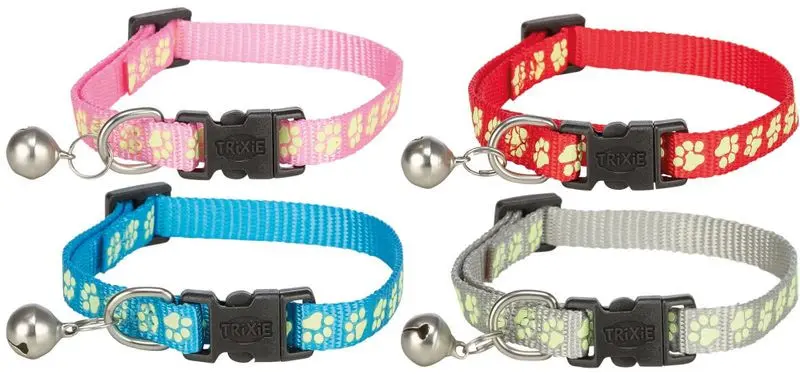 Klassiskt katthalsband med bjällra och säkerhetsspänn, i fina ljusa färger med flourescerande tassmönster runt om. Flourescerande betyder att tassarna lyser när de är laddade med ljus (det är inte samma sak som reflexer).