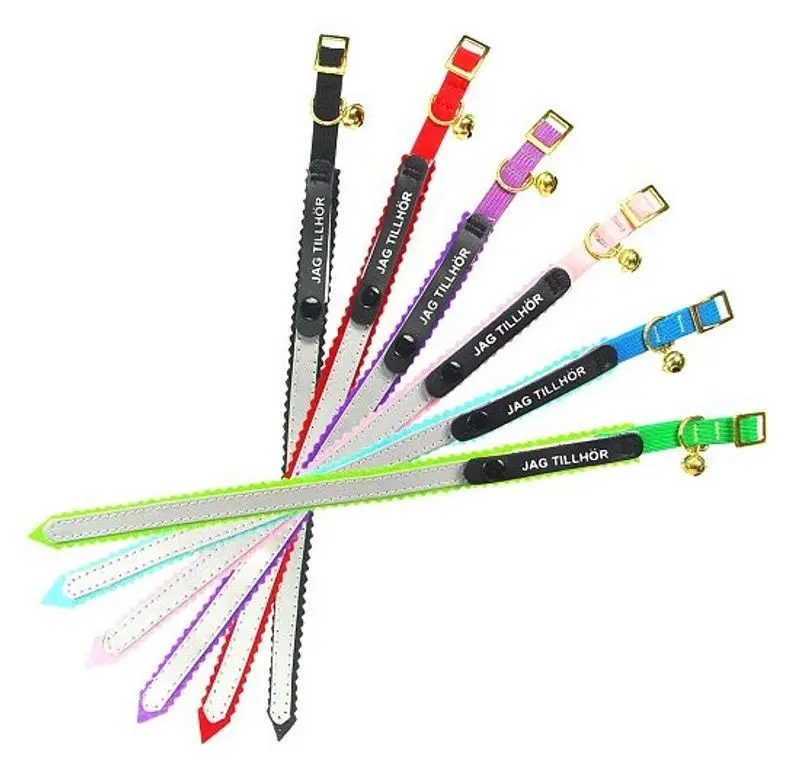 Katthalsband i snygga färger med en reflexremsa på utsidan så att katten syns ordentligt på sina nattliga utflykter. Under den svarta fliken märkt Jag Tillhör, finns plats att skriva mattes eller husses telefonnummer så att dessa lätt kan kontaktas ifall kisse skulle komma vilse.