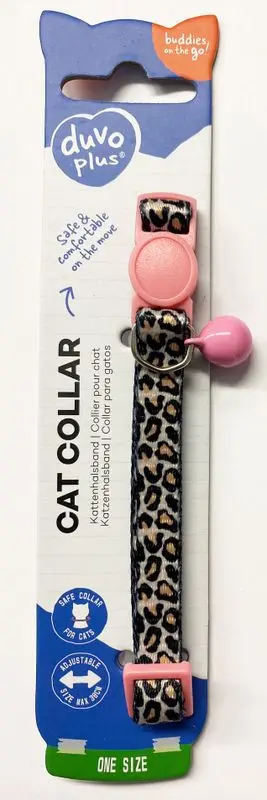 Katthalsband i snygg design till din katt, tillverkat i mjuk leopardmönstrad nylon med dekorativa rosa detaljer.