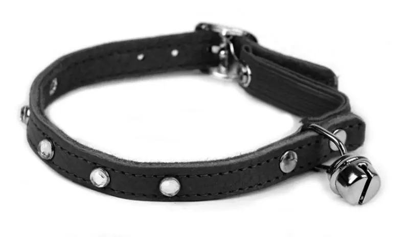 Riktigt fint läderhalsband i svart färg med dekorstenar. Fint bling-bling till din katt!