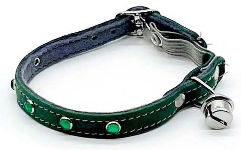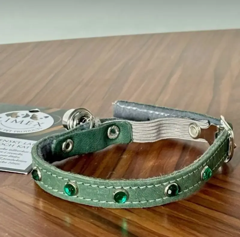 Riktigt fint grönt läderhalsband med dekorstenar i klargrönt. Fint bling-bling till din katt! Såklart inte äkta smaragder, men en kisse kan ju alltid låtsas!