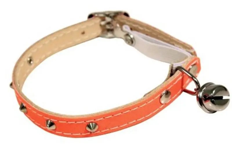 Katthalsband med helreflex till din katt, perfekt till mörka sommar-, höst- och vinterkvällar. Reflekterande läderhalsband med dekornitar och synlig orange färg.
