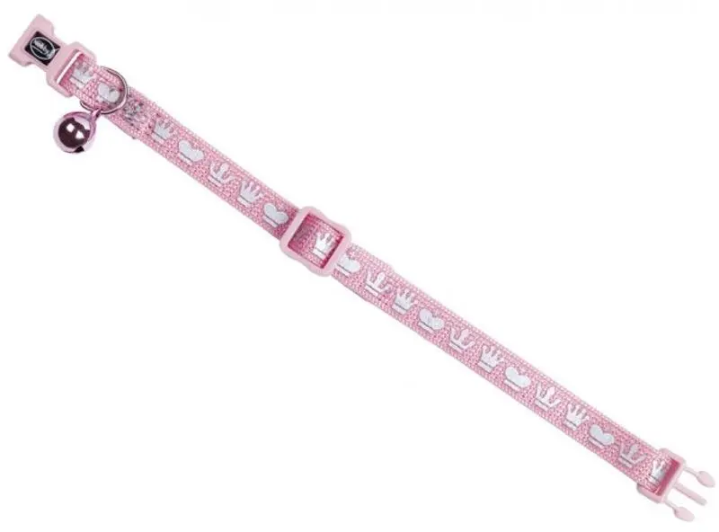 Detta snygga ljusrosa katthalsband har ställbar storlek och ett safetyknäppe som löser ut om katten skulle fastna utomhus med halsbandet.