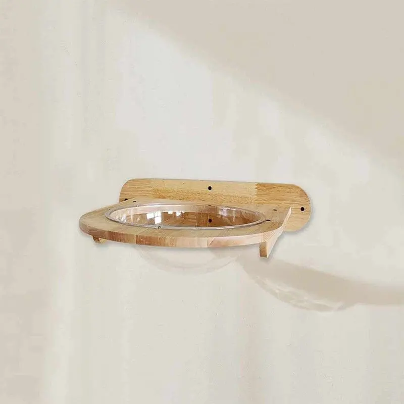 En kul och rolig katthylla som är väggmonterad. En blandning mellan något som ser ut som en genomskinlig salladsskål och en halv rymdfarkost.