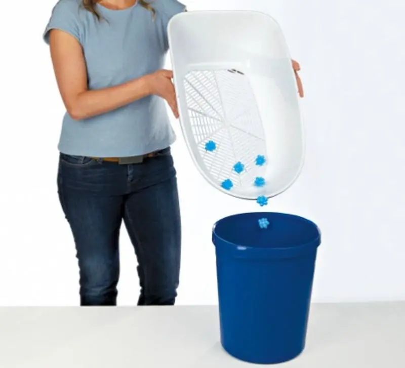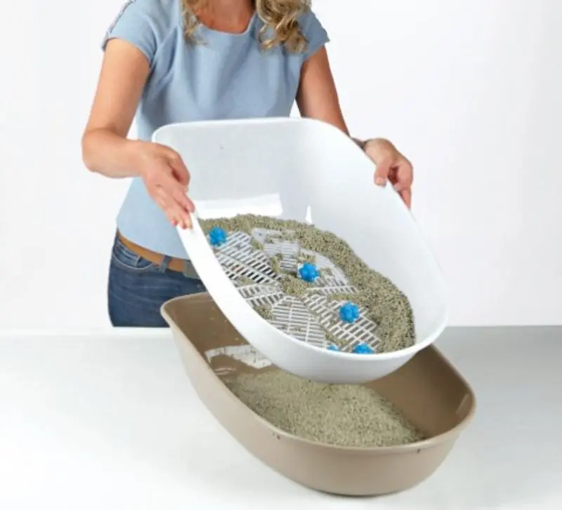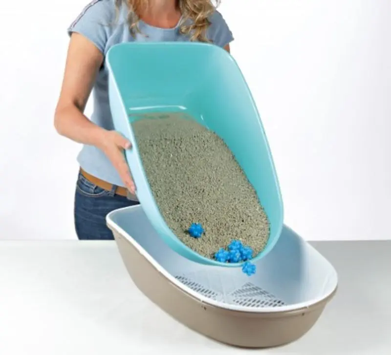 Se till att ha ett bra klumpande strö samt tillräckligt med strö i lådan så att urinen inte klibbar fast i silbotten när man häller över.