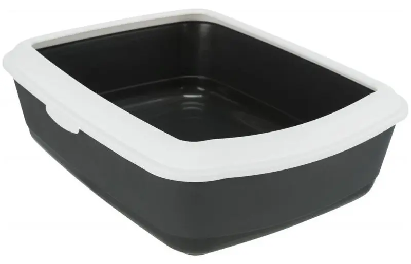 Klassisk öppen kattlåda i en bra storlek för en vuxen katt, vit sprättkant som minskar på sanden som sprättas ut på golvet. En snygg mörkgrå stilren färg som passar in i hemmet.