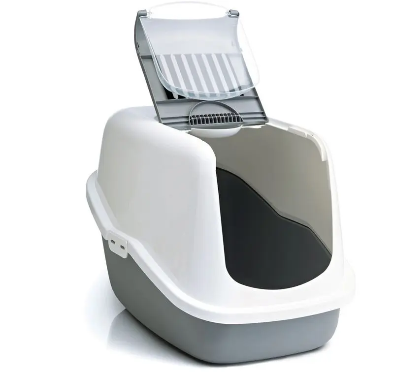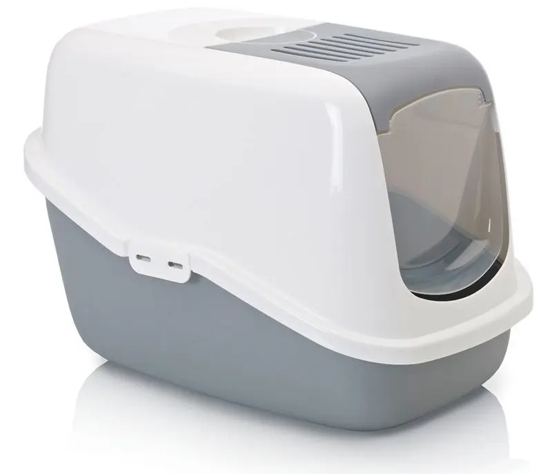 Lagom stor toalåda med extra hög bakkant för att undvika att ströet kommer in mellan huven och botten när katten skottar runt inuti den, även för att förhindra eventuellt urinläckage.