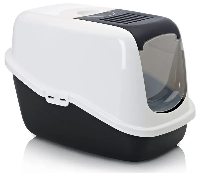 Lagom stor toalåda med extra hög bakkant för att undvika att ströet kommer in mellan huven och botten när katten skottar runt inuti den, även för att förhindra eventuellt urinläckage.
