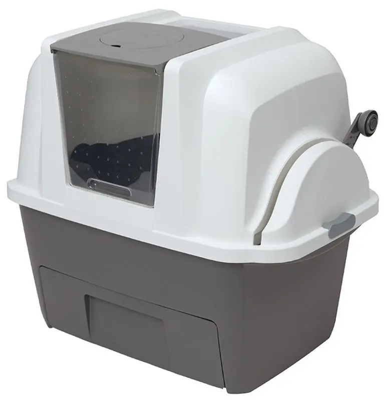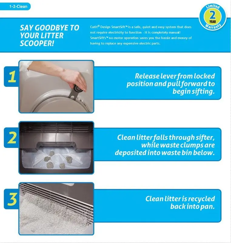 SmartSift Airsift kattlåda är ett säkert manuellt system, utan motorisering och inga dyra elektroniska delar att ersätta. Denna miljövänliga funktion med spaken på sidan är tyst och säker, vilket gör toalådan mycket kattvänlig. SmartSifts täta konstruktion förhindrar damm.