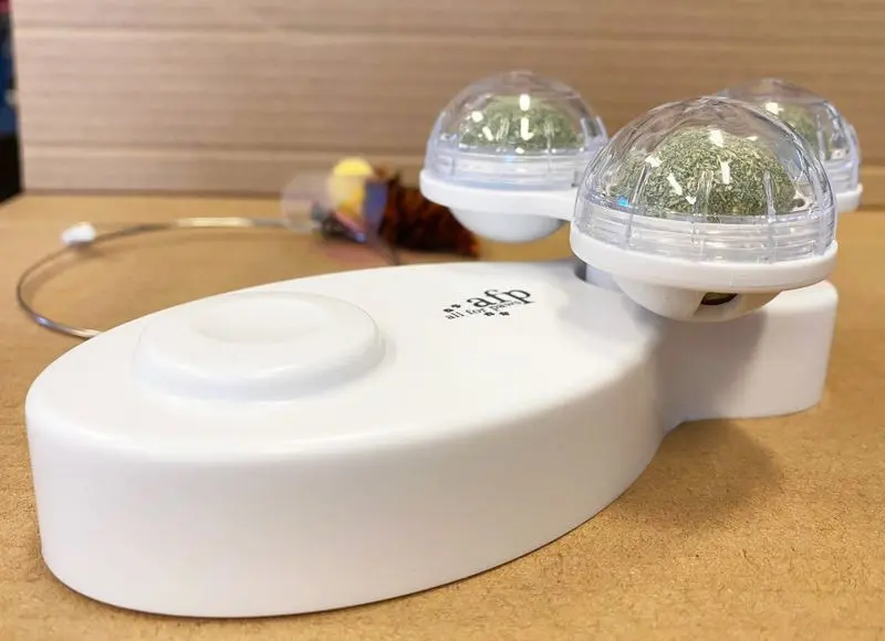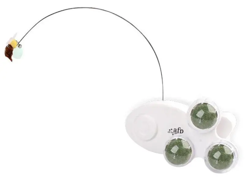 Den flexibla stålwiren med fäst leksak och fjädrar lockar din katt till lek, samtidigt som de tre bollarna med torkad matatabi+kattmynta catnip ger extra stimulans.