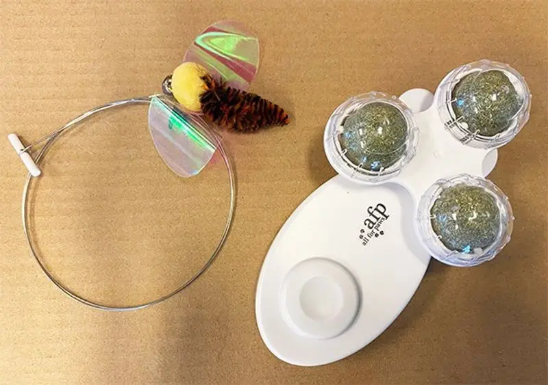 Innehåll: Leksak med fjädrar på stålvajer, 3 bollar med matatabi och catnip
