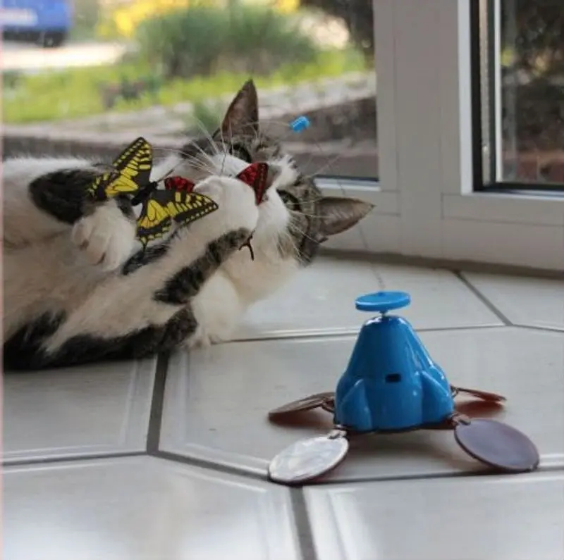 Whirling Wiggler designades med din katts inre jägare i åtanke. Härliga fladdrande fjärilar som din katt kan hoppa efter, springa runt och tassa till! Whirling Wiggler tillåter din katt att smyga och jaga med både rörelser