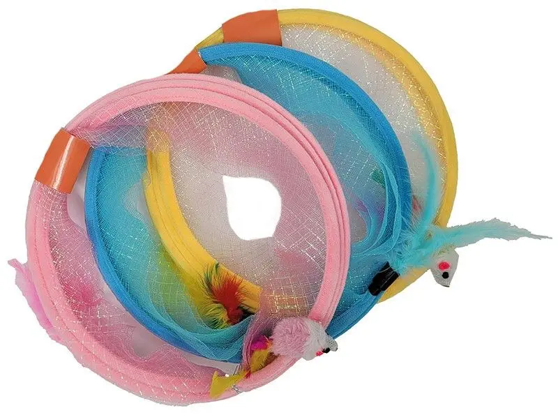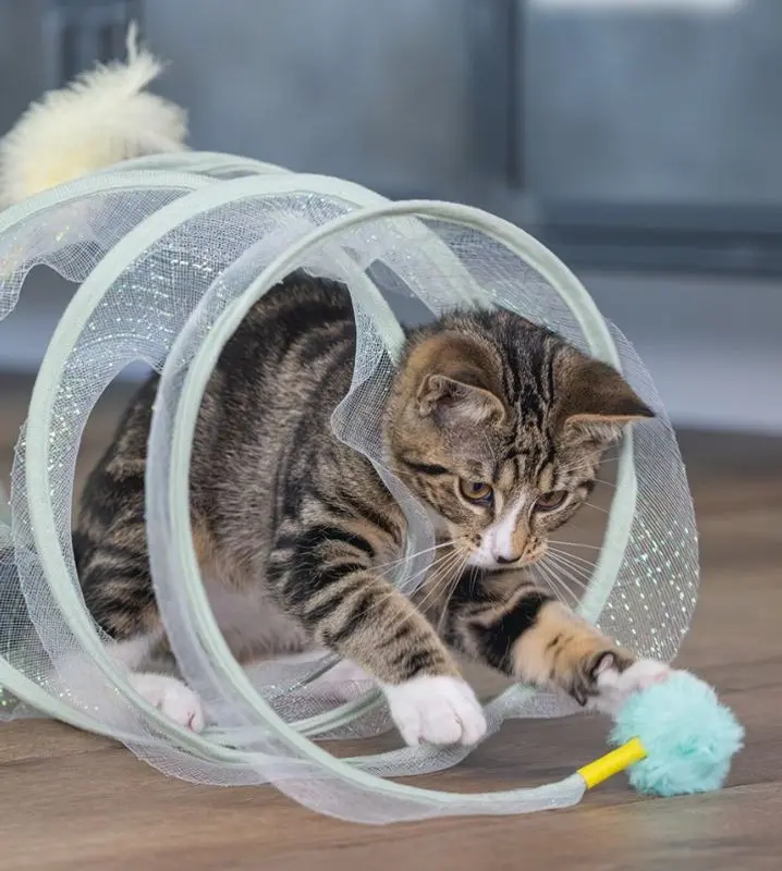 Istället för den vanliga lektunneln har man tänkt om litegrann vid designen av denna tunnel. Kvar är spiralfjädern, lite glittertyg och en leksak i var ände av spiralen. En pingla som ger ljud-feedback när tunneln rör på sig och fjädrar som lockar till lek och bus. Mycket rolig tunnel för katter i alla åldrar!