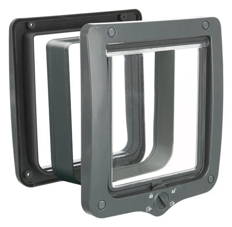 4-vägslås betyder att denna kattlucka kan ställas i 4 olika lägen: helt öppen, helt låst eller endast öppen för ingång (men ej ut) eller endast öppen för utgång (men ej in).