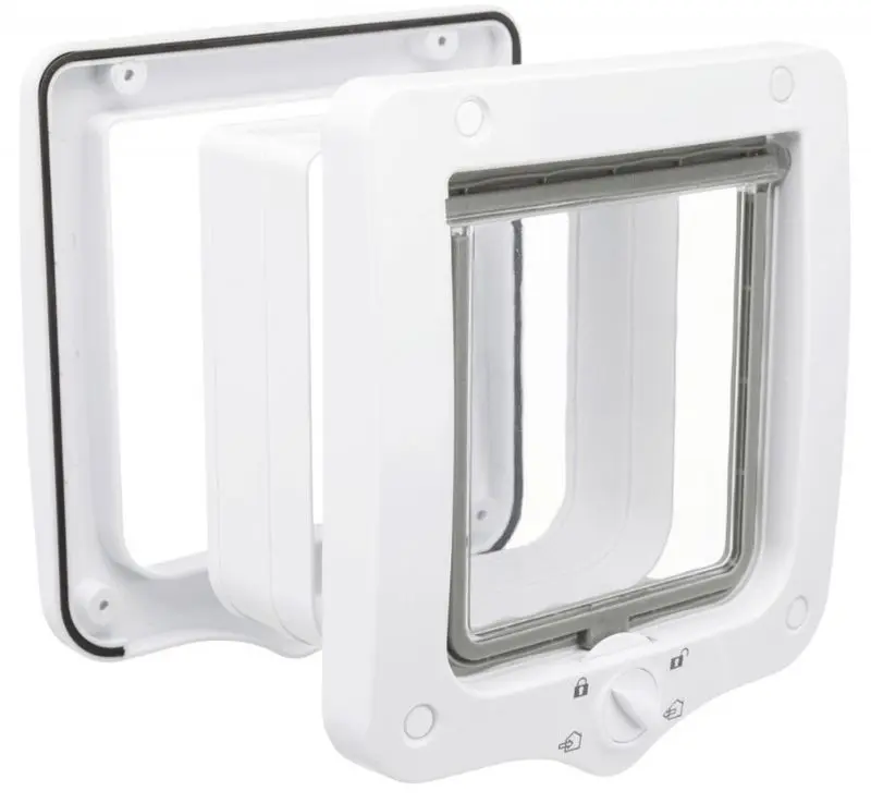 Klassisk kattlucka i vit färg med 4 olika lås-lägen, så kallad 4-vägs kattlucka. Tillverkad i plast med en mjukstängande, transparant svänglucka. Kattluckan har TPR-gummi som en list runt hela öppningen, samt ett magnetlås som gör att svängluckan inte slår i vinden.