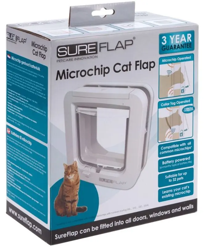 Sureflap läser 15-siffriga, 10- och 9-siffriga chipkoder och håller alla programmerade chipkoder i minnet även vid strömavbrott. Kattluckan kan programmeras för 32 olika microchipkoder!