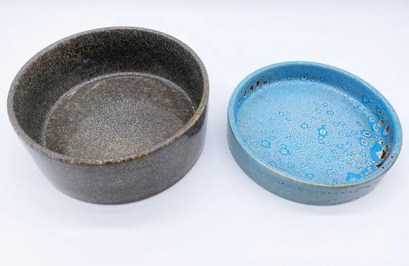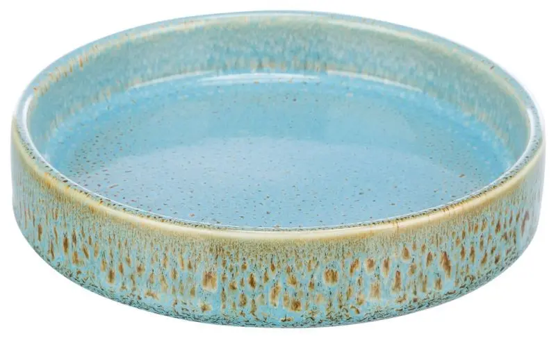 Dessa matskålar har en superfin glasering i turkost och brunt, glaseringen blir lite olika på varje matskål och varje matskål är därför helt unik i sin färgsättning. Vissa matskålar har ett mindre "mönster" som skålen på den fotade produktbilden, och andra matskålar har fått lite större mönster på sin glasering.