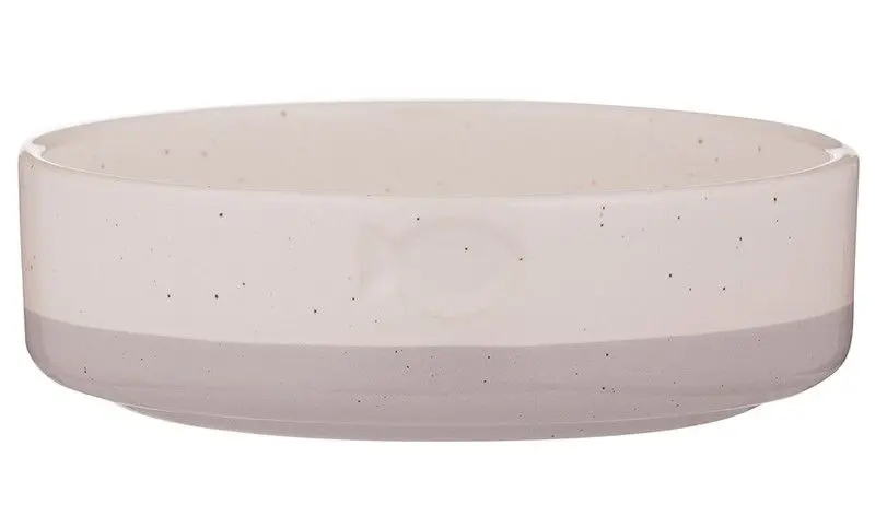 En fin kattmatskål i tålig keramik, med dekorativ "fisk" tryckt på utsidan av skålen. En funktionell matskål med låg kant, så att de känsliga morrhåren ej tar i skålkanterna medan katten äter eller dricker. De tjocka sidorna av tungt stengods ger en stabil och hållbar skål som kan stoppas både i diskmaskinen och frysen. Det hjälper också till att hålla kattens mat och vatten svalare längre.