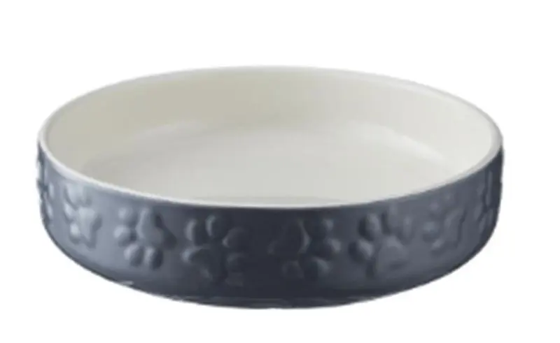 En jättefin kattmatskål i vit keramik med grå utsida, dekorativa "tassar" på utsidan av skålen. En funktionell matskål med extra låga kanter, så att de känsliga morrhåren ej tar i skålkanterna medan katten äter eller dricker.