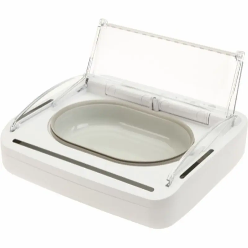 En foderautomat med rörelsesensor som öppnar sig när ditt husdjur (katt eller hund) närmar sig matskålen. En smart foderautomat som gör att kattmaten håller sig fräsch lite längre och inte torkar ut lika fort - om du har en katt som vill småäta sin mat under en längre tidsperiod.