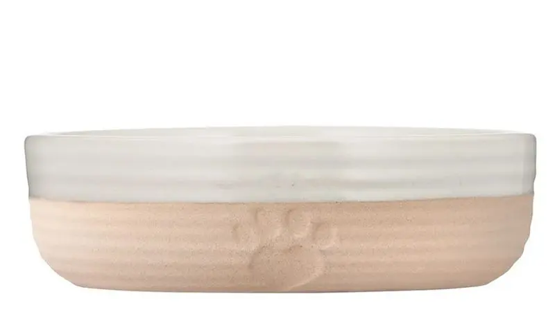 En jättefin kattmatskål i tålig keramik, ett dekorativt "tass-hjärta" på utsidan av skålen. En funktionell matskål med låg kant, så att de känsliga morrhåren ej tar i skålkanterna medan katten äter eller dricker. De tjocka sidorna av tungt stengods ger en stabil och hållbar skål som kan stoppas både i diskmaskinen och frysen. Det hjälper också till att hålla kattens mat och vatten svalare längre.