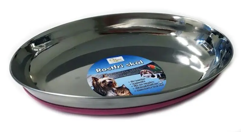 Klassisk kattmatskål eller vattenskål i rostfritt stål och låg kant. Både den ovala formen på skålen samt den låga kanten gör det bekvämt för katten när den kan äta utan att de känsliga morrhåren slår i skålens kanter. Gummerad undersida, i rosa färg, så skålen hålls på plats och ej styrs omkring på golvet.