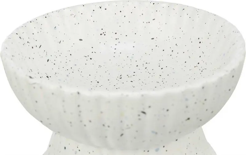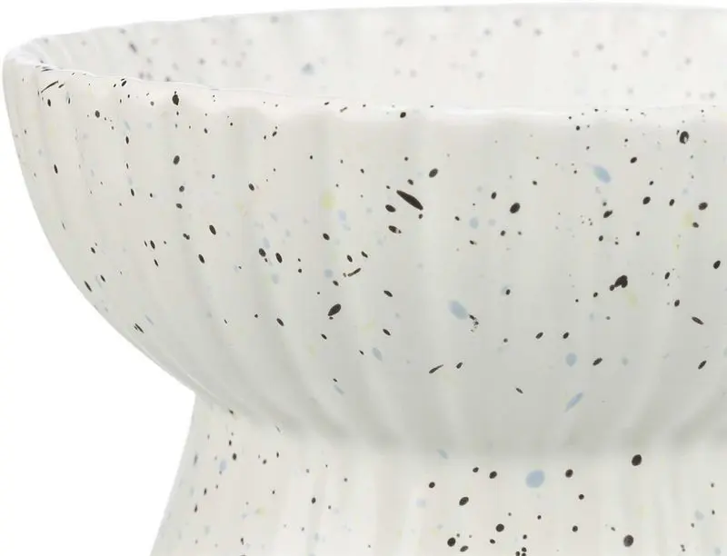 Skålen har en räfflad utsida, och är melerad i ett fräckt random mönster med små blå, gröna och svarta prickar.