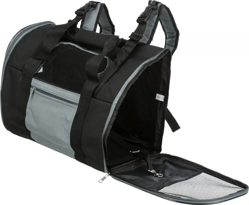 Funktionell ryggsäck med justerbara axelremmar tillverkad i nylon. Väskan kan öppnas framtill och på ena sidan för katten och har ett kort koppel fäst på väskans insida så att katten inte kan hoppa ut om man vill ha väskan lite öppen.