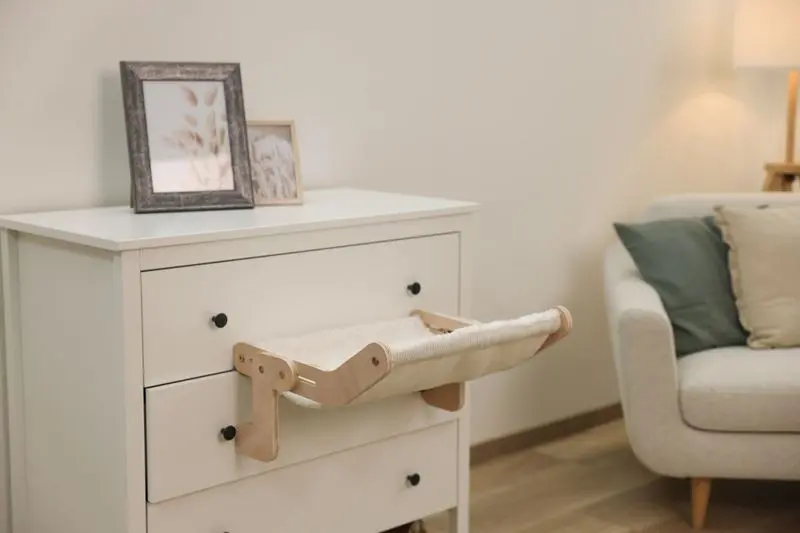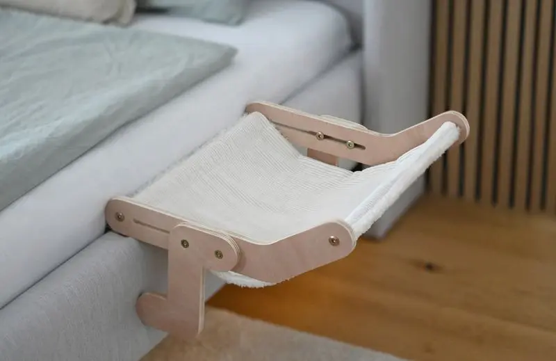 Hammocken har en stadig stomme i massiv trä som både ser snygg ut och ger stabilitet. Den mjuka, vändbara liggytan i plysch är lätt att ta av och tvätta i maskin. En låsbar stödfot gör att du kan anpassa höjden efter möbeln, så att hammocken står stabilt utan att skada ytan.